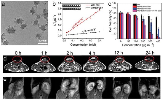 (a) TEM micrographs of PDA@ut-MnO2/MB NFs. (b) The r1 values of PDA@ut-MnO2/MB NFs with and without 5 mmol L−1 GSH. (c) An assessment of PDT/PTT efficacy using PDA@ut-MnO2/MB NFs via CCK-8 assays. In vivo MR images of HCT 116 tumor-bearing mouse (d) tumor and (e) kidneys different time points after the intravenous injection of PDA@ut-MnO2/MB NFs (0, 1, 2, 4, 12, and 24 h; 0 h means pre-injection) at a dose of 10 mg Mn kg−1 (adapted from Sun et al. 2019 [125], Copyright 2019 The Royal Society of Chemistry and reproduced with permission).