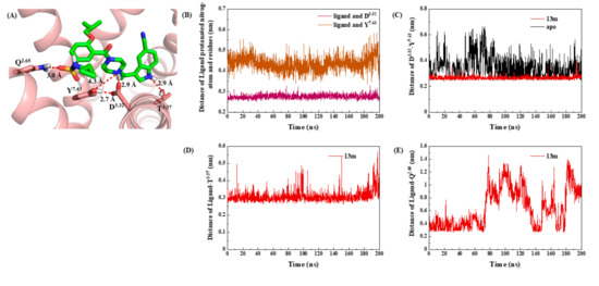 In 13m-5-HT1AR system, a conserved hydrogen bond was formed between the NH group of the indole ring in 13m and the oxygen atom of hydroxyl in T3.37 during the simulation (Figure 4A,D). At the same time, the protonated nitrogen atom in 13m maintained a stable hydrogen bond with the carbonyl oxygen of D3.32 and a relatively weak interaction with the hydroxyl oxygen of Y7.43 (Figure 4B). Therefore, the interaction between D3.32 and Y7.43 (also called 3-7 lock) stayed unbroken in 13m-5-HT1AR system but experienced big fluctuation in apo system (Figure 4C). This phenomenon was in agreement with the previous study of our group [28]. The oxygen atom on the sulfonyl group of 13m formed a hydrogen bond with Q2.65 initially, but it fluctuates greatly due to the swing of the molecular tail after 80 ns (Figure 4E).
