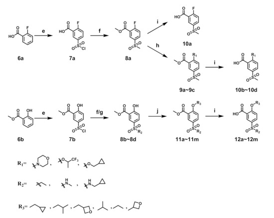 Synthesis of the 5-sulfonyl benzoic acid was outlined in Scheme 2. Compound 7a was obtained by the sulfonation reaction of 6a and chlorosulfonic acid. 7a reacted with sodium sulfite and then alkylated by iodomethane to give 8a. 8a was deprotected by lithium hydroxide to give 10a. Synthesis of 10b–10d was accomplished by reaction of 8a and corresponding reagents and then deprotection by lithium hydroxide. For 8b–8d, the starting material was methyl salicylate and the synthetic route was similar to 8a. Compounds 11a–11m were obtained by Mitsunobu reaction of 8b–8d and corresponding alcohol or alkylation of 8b–8d and 3-iodo-oxetane, which were then deprotected by lithium hydroxide to give compounds 12a–12m.
