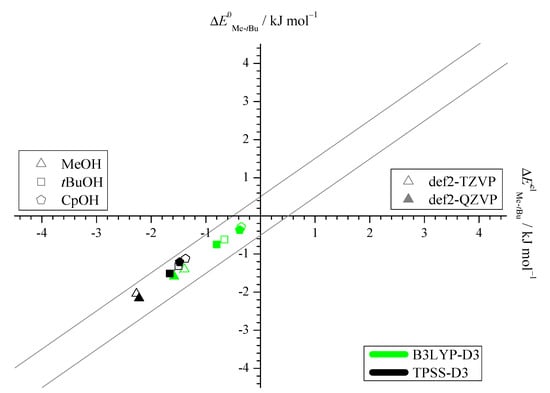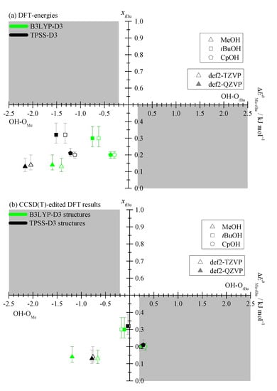 Second, one can replace the DFT electronic energy difference between isomers by the corresponding DLPNO-CCSD(T) difference and keep the structural and ZPVE contributions from the DFT level. This generates a variant of Figure 6a, in which the data points for all larger alcohols now fall close to or into the lower-right grey and thus unphysical region, where major tBu docking is expected but Me docking is predominantly observed (see Figure 6b). Only MeOH stays in the physically meaningful range. The mere fact that DLPNO-CCSD(T) correction leads to such large energy difference changes casts doubt on the quality of the DFT (in particular TPSS) structures. Note that all 12 corrections (see Table S12) promote tBu docking, so the DFT error is highly systematic. For B3LYP, the corrections stay below 1 , for TPSS they always exceed 1 . Because experiment is consistent with a preference for Me docking in all cases, this likely means that the DFT structures for Me docking are relatively far from the best ones, in particular for TPSS. As the CCSD(T) corrections are quite uniform for all three alcohol–pinacolone complexes, it is plausible that the deficiency does not reside so much in the dispersion correction but rather in the functional and its description of differences in hydrogen bonding to the acceptor C=O group.