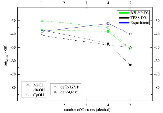 Computed OH wavenumber difference between the two docking sides relative to the number of C-atoms of the corresponding alcohol. This shows that the employed computational methods predict the same spectral trends for MeOH and tBuOH, indicated by dashed lines. For CpOH a somewhat larger discrepancy can be observed, with the smaller basis set TPSS result differing most from the experimental trend (blue) (see Table S4 for details).