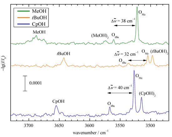 In Figure 4, the experimental infrared spectra for helium supersonic jet expansions of Pin with MeOH (green), tBuOH (orange) and CpOH (blue) are shown. They feature the rovibrationally broadened alcohol monomer OH stretching bands (MeOH, tBuOH, CpOH), the downshifted hydrogen-bonded homodimer signals (, and ), as well as the narrow bands of the mixed complexes with docking isomerism and . For MeOH, and are spectrally downshifted compared to the respective homodimer band, as one might expect from an intrinsically stronger OH⋯O=C interaction, whereas, in the case of tBuOH and CpOH, they are upshifted. This is already an experimental sign for competition between hydrogen bonding and more global London dispersion interactions. Even when the alcohol is in Me docking position, where there is no sterical crowding, it is displaced out of the ketone plane to maximize interaction with the tBu group (see Table S2). When CpOH is combined with acetone, which lacks the tBu group (see Figure S6), the homodimer and mixed dimer signals actually overlap. This is partly due to less competition from dispersion interaction with the other side of the ketone for the hydrogen bond.