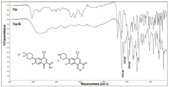 Figure 2A). As the literature has reported, the shift of the peak in this region can suggest the formation of a six-member ring as a result of the attachment of Cip to the metal via the carboxylate and ketone groups. As a consequence, such modification can disturb the conjugation system of the Cip structure [