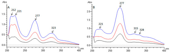 Chromatographic analysis was carried out at λ = 279 nm (spectrophotometric (UV) detection) and at λex 279 nm/λem 430 nm (fluorescence (FL) detection) on the Waters, e2695 Aliance, HPLC system (Waters Co., Milford, CT, USA) equipped with the Purospher STAR RP-18, 4 × 125 mm (5 µm), column (Darmstadt, Germany), and the Waters Empower Pro v.2 software for acquiring, processing, reporting and managing the chromatographic information using a mixture of triethylamine–acetonitrile–methanol–phosphoric acid (10 mM) (0.2:25:25:50, v/v/v/v) as the mobile phase at a flow rate of 0.7 mL/min.