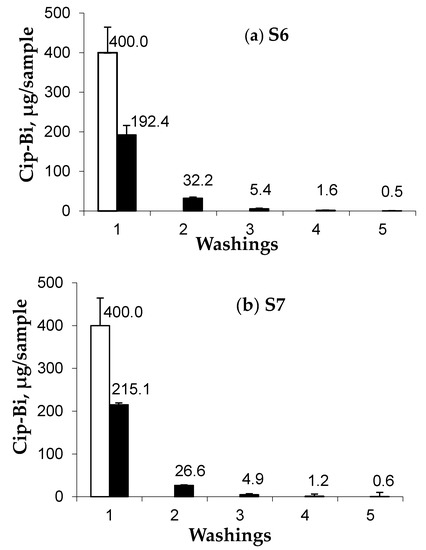 A significant increase in antibacterial activity for the Cip-Bi hydrogel-loaded dressings (experimental samples: S6 and S7) in relation to the hydrogel-loaded dressing without Cip-Bi complex (control samples: S4 and S5) was confirmed by Tukey’s test (p (0.0002–0.02) < 0.05).