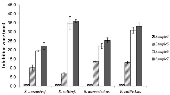 The zones of inhibition, on the Mueller Hinton agar, around the modified dressings containing approximately 0.4 mg of Cip-Bi, were 19.5–36.0 mm. The untreated dressing (sample (S)1), similarly to the dressing activated with bromine (S2) or iodine (S3), showed no inhibition zones against the reference strains. The bromine-activated dressing loaded with hydrogel (S4) showed an insignificant activity, whereas the activity of the dressing with hydrogel but activated with iodine (S5) was slightly higher against both bacterial species (7–10 mm and 13–15 mm for the reference and clinical strains, respectively). However, the antibacterial activity of the Cip-Bi-loaded dressings (S6, S7) was by far the largest, as it is illustrated in
