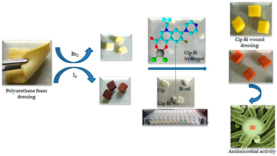 The samples of the polyurethane foam dressing of about 0.5 × 0.5 cm in size were modified using a two-step approach. Initially, the samples were activated using two activating agents and next, they were loaded with a hydrogel containing ciprofloxacin-bismuth complex (Cip-Bi hydrogel). In order to obtain the Cip-Bi hydrogel, 5 mg of chitosan and 15 mg of bismuth-ciprofloxacin complex were dissolved in 10 mL of 10% citric acid, then 5% glutaraldehyde and PEG-200, each in the amount of 0.3 mL, were added and a mixture was made up to 15 mL with ethanol (Cip-Bi concentration was 1 mg/mL). In the method 1, the samples were gently stirred with a 1% ethanolic iodine solution for 1 h at 37 °C. The excess solvent was removed by placing the samples on the filter paper. Next, the samples were treated with the Cip-Bi hydrogel. In the method 2, the samples were prepared in the same manner, but using a 1% ethanolic bromine solution as an activating agent. The samples subjected to further qualitative tests were previously dried at 37 °C.