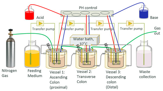 The HCM system in this study was designed based on the three-stage continuous culture system in a previous study [33]. It contains three vessels; vessel 1 (V1) has a 1 L operating volume at pH 5.6, V2 has a 1.6 L operating volume at pH 6.2, and V3 has a 1.2 L operating volume at pH 6.8, which mimic the environmental condition of the ascending colon, transverse colon and descending colon, respectively (Figure 1). The culture system was inoculated with fresh feeding medium three times a day at the volume of 100 mL each time, to mimic the feeding of breakfast, lunch and dinner time. There is a 1 h delay time between the feeding medium being transferred from V1 to V2, and V2 to V3, to allow sufficient time for the microbial metabolism of nutrients in each vessel. The feeding medium initially contained GAM for the equilibrium period and 0.67 mg/mL green tea extract was added into the GAM medium for the treatment period that was recalculated based on the references [40]. An offline stomach process included a one-hour incubation of medium at pH 2 in 37 °C, followed by a two-hour incubation with the addition of digestive enzyme at pH 5.5 in 37 °C for digestion, and feeding content was applied before the medium was added into the system [41]. The vessels were water-jackets with warm water at 37 °C, supplied by a program-controlled circulating water bath. N2 gas was used to maintain the anaerobic atmosphere by constantly bubbling into the vessels, pH solutions, and feeding medium at 0.5 L/min. Gastrointestinal motility was mimicked in each vessel by using an automatic controlled-speed stir rod, and the pH of each vessel was adjusted automatically by pumping acidic and basic solutions into each vessel via our in-house LabView program. Samples of each vessel were collected through sampling ports once a day. The bacteria cell number was obtained by applying a drop plate method based on a published study [42].