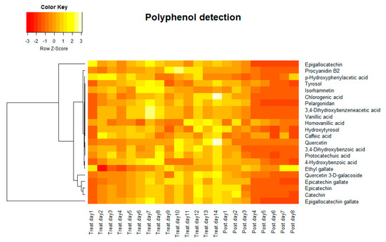 Samples collected from the treatment period and post-treatment period were analyzed by a targeted HPLC-MS/MS polyphenol method to detect relative polyphenol concentration. The targeted analysis identified 22 polyphenols that were differentially expressed in the HCM in the treatment period and post-treatment period. As is shown in the heat map (Figure 2), the relative concentration of polyphenols in the HCM (the average of all three vessels) increased through treatment days and decreased post-treatment. Polyphenols have attracted great interest from researchers due to their antioxidant properties [59]. In addition to their antioxidant properties, others also showed that they can modulate the activity of a wide range of enzymes and cell receptors [60], and this motivated researchers to study the health effects of polyphenol consumption. It is important to realize that the high abundance of polyphenols in the diet does not necessarily guarantee their bioavailability and bioactivities in the human body. This is mostly because of either the lower efficiency of absorption by the human body or their low intrinsic activity [61]. Typically, most polyphenols cannot be absorbed in their native forms, which present as esters, glycosides, or polymers. Intestinal enzymes or colonic microflora can hydrolyze these substrates and help them be absorbed [61]. Our results indicate that the gut microflora took up polyphenols during the polyphenol treatment period, and maintained relatively stable intracellular polyphenol concentrations. The intracellular polyphenol abundance dropped once the treatment was stopped.