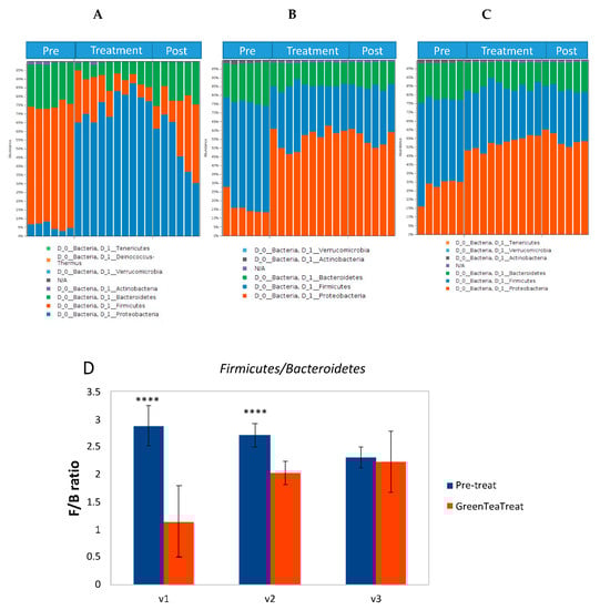 Bar charts representing bacterial taxonomy based on the 16 S rRNA gene at the phylum level in 3 parts of HCM ((A). Vessel 1; (B). Vessel 2; (C). Vessel 3). (D). Firmicutes/Bacteroidetes ratio, n = 6 for pretreatment samples, and n = 10 for GTE treatment samples. DNA was isolated from vessel contents for MiSeq sequencing. The relative abundance of bacteria was calculated based on the operational taxonomic unite (OTUs) (**** p < 0.001).