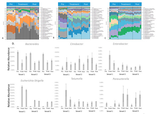 Bar charts representing bacterial taxonomy based on the 16 S rRNA gene at the genus level in 3 parts of the HCM ((A). Vessel 1; (B). Vessel 2; (C). Vessel 3). (D). The relative abundance of the significant genus in a three-time period. DNA was isolated from vessel contents for MiSeq sequencing. The relative abundance of bacteria was calculated based on the operational taxonomic unit (OTUs). The Y-axis represents the relative abundance of each detected genus.