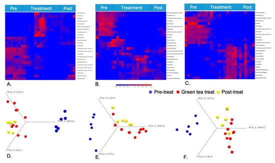 Heat map presentation of intracellular metabolic profiles computed by Euclidean distance and Ward’s hierarchical agglomerative clustering method (A. Vessel 1; B. Vessel 2; C. Vessel 3). Principal component analysis (PCA) of 130 targeted metabolites comparison for pretreatment days, green tea treatment days, and post-treatment days (D. Vessel 1; E. Vessel 2; F. Vessel 3).