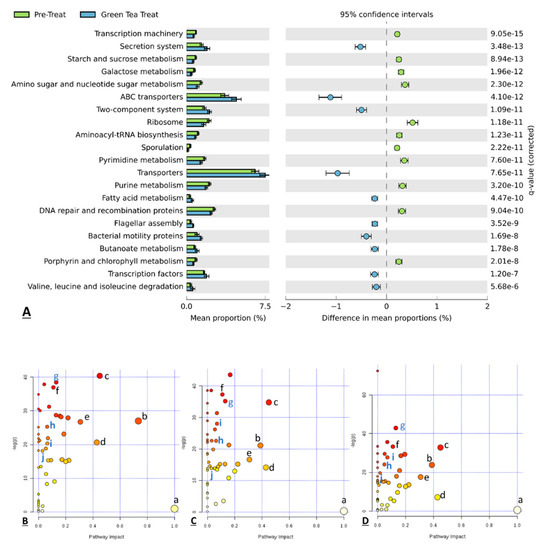 The difference in the mean proportion of microbial functions between the pretreatment samples and treated samples along with the associated 95% confidence interval of this effect size, q-value below 0.005, and the difference between proportions above 0.2 (A). Representative pathway analysis indicated major pathways in the comparison of pretreatment samples vs. green tea treated samples ((B–D) for vessel 1, vessel 2, and vessel 3). Some common pathways of three vessels that have –log(p) above 10 are labeled in lower case letters as: a. Inositol phosphate metabolism; b. Alanine, aspartate, and glutamate metabolism; c. Glycine, serine, and threonine metabolism; d. Biotin metabolism; e. beta-Alanine metabolism; f. Cysteine and methionine metabolism; g. Aminoacyl-tRNA biosynthesis; h. Pyrimidine metabolism; i. Purine metabolism; j. Butanoate metabolism.