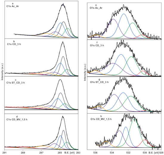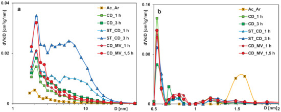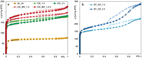 In general, the adsorption isotherms exhibit a steep increase in the gas uptake at low relative pressures, corresponding to the micropores filling; thus, microporosity in the porous structures was developed during the synthesis process. However, differentiated amounts of gas uptake and different shapes of hysteresis loops at moderate and high relative pressures indicate the development of various extents of mesoporosity. In the case of the samples ST_CD_1 h and ST_CD_3 h, a significant increase in nitrogen adsorption at moderate and high relative pressures (with a higher slope) is observed, which indicates the increase in mesoporosity due to the pore widening and partial pore collapse. The hysteresis loops for the adsorbents belong to type H4, suggesting existence of the slit shaped mesopores. The carbon Ac_Ar is characterized by the slightest development of porous structure.