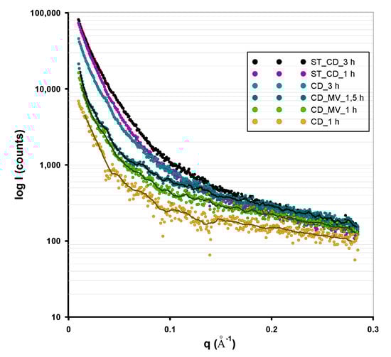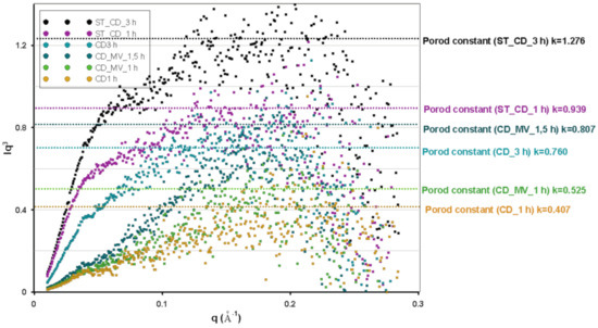 The small-angle X-ray scattering (SAXS) measurements were performed using an Empyrean diffractometer (PANalytical, Malvern, United Kingdom ) equipped with CuKα radiation (λ = 1.5418 Å) applying transmission geometry in the range of 0.1 to 4 degrees of 2θ and EasySAXS software as a toolbox for SAXS data analysis. The relevant parameter to SAXS analysis is the momentum transfer or scattering vector q defined as where θ is the angle between the incident beam and the detector measuring the scattered intensity, and λ is the wavelength of the radiation. Porod approximation was applied to treat the SAXS data for evaluation of interfacial area between the matrix and the scattering objects (pores). Here, the course of the scattering intensity at a higher q range plays a significant role. Porod constant (kp) can be applied for the determination of the specific surface area of the two-phase system using X-ray scattering at small-angle: