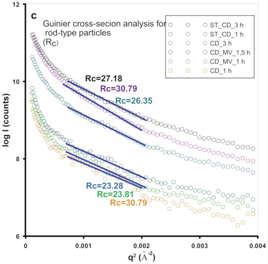 Figure 4 shows the Guinier analysis of SAXS curves for various shape of inhomogeneities. The SAXS curve is described by A. Guinier’s approximation when the relation 0.1 < qRg < 1 is fulfilled (Rg is defined as radius of gyration of the particles). A nonlinear dependence of log(I) = f(q2) indicates the presence of agglomeration and morphological disorders compared to the model assumptions. In the case of investigated carbon samples, the linear range of the Guinier curves for particles with spherical morphology is quite narrow, what may suggest the small amount of this type of inhomogeneities in the whole matrix. However, this type of inhomogeneity (porosity) was confirmed for all samples of carbonaceous materials. The radius of gyration Rg which is the parameter describing the scattering ability and compared with the diameter of carbon particles is similar for all investigated samples, and varies from 59.49Å to 66.40Å, and suggests the size of spherical pores around 6 nm. The largest differences in the size of the scattering particles with spherical morphology were observed for CD_1 h and CD_3 h being one of the pairs that differ only in the time of activation—59.49Å and 66.40Å, respectively. This suggests the size increase of the particles responsible for X-rays scattering at such small angles (increasing the pore size) according to the activation time. A similar effect was observed for other pairs of samples. Generally, the increasing time of activation generates the increasing pore size, and moreover, the highest efficiency in the development of porous structures with spherical morphology was noted for the activation with carbon dioxide. Additionally, the Guinier analysis for rod-type particles was also performed due to the significant linear region visible in higher q values. In this case, the linear region was significantly wider. The radius of gyration for rod-type particles (Rc) suggest the size of pores ~2–3 nm, and the size decreases with the increasing time of activation. This may suggest the creation of new pores during activation and their gradual increase in the process. Moreover, when the greater deviations from Guinier’s approximation are observed, the more non-dimensional and elongated form is present in the sample. This observation was noticed for greater values of the q parameter. This is the case for smaller objects, i.e., scattering in the range of higher q values. The results of SAXS analysis should be compared with the analysis of pore size distributions from low-temperature N2 adsorption/desorption. The comparison of the scattering intensity (I(q)) with the SBET values is justified. In both cases, the SBET and I(q) values increase when the longer time of activation was applied (one exception is in the case of CD-1 h and CD_3 h samples where the SBET doesn’t change so directly). In both cases, the good correlation was also obtained in the size of pores determined by SAXS and HK pore size distributions. Especially for rod-type structures, their size was surprisingly similar (from 2.3 to 3.1 nm from SAXS and 2–3 nm from HK).