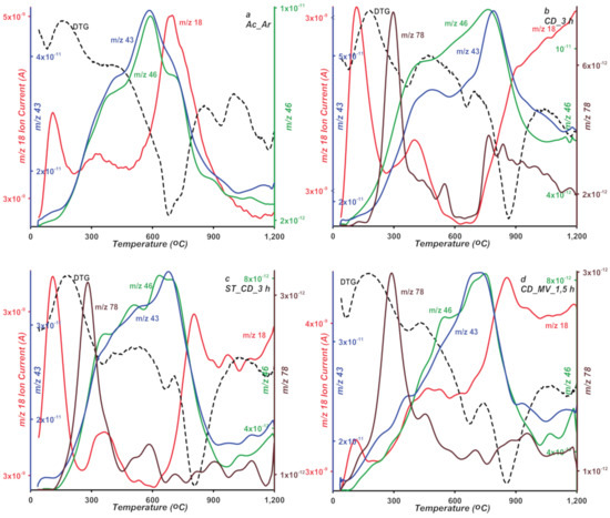 In the temperature range 450 to 1060 °C the oxygen species with a more complex structure and requiring a greater heat energy supply are defragmented and thermally decomposed successively. The process is accompanied by the release of volatile products mentioned in the previous stage. Additionally, starting from temperature of about 600 °C for Ac_Ar and 700 °C for the other samples, a distinguished signal of carbon monoxide appears in mass (m/z 28) and FTIR spectra. For the discussed temperature range, mass loss is within 6–15%. As in the previous temperature range, the largest mass loss for the Ac-Ar sample is observed, which indicates a greater number of acidic groups both with low thermal stability and the ones more resistant to high temperatures. Considering large mass loss of samples, distinguished peaks on the DTG curves and high intensity of signals from released gas products, the temperature range 450–1060 °C can be described as a predominant stage. Furthermore, this stage can be divided into two substages with different temperature range and course depending on a type of sample. For the Ac_Ar sample, the main stage corresponds to the DTG peak with a minimum at 700 °C and the second one corresponds to a minor peak with a minimum at 940 °C. The opposite situation is for other samples, the main peak (with min. at 800–850 °C) is preceded by the minor peak (with min. at 660–675 °C). The bands on the CO2 profiles with max. at 580 or 680 °C for the Ac_Ar sample and for other samples can be assigned to carboxylic anhydrides (the CO2 signal is accompanied by the CO one for this case) and chemically different lactones (with greater stability in comparison to the ones detected at lower temperature range). On CO profiles we can observe one or two bands originated from phenolic, hydroquinonic, carbonylic, quinonic groups, or ethers. However, a precise indication of the type of functional groups that are thermally degraded seems impossible, because temperature of the described processes depends on many variables such as: a porosity of material or a heating rate, so literature data on this issue are sometimes very divergent. In turn, on the water spectra there is a distinguished peak corresponding to temperature of the main peak on the DTG curve related with decomposition process of more stable acidic complexes. Starting from a temperature about 1060 °C degradation of alkaline moieties-pyrone structures occurs. At this stage mass loss (1.2–5%) is observed.