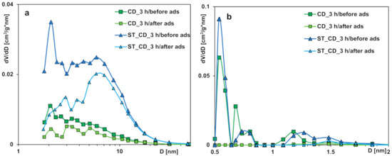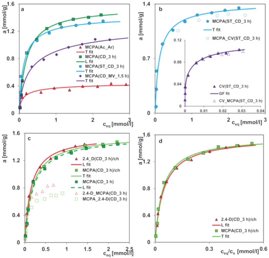 In Figure 12b, the comparison of MCPA adsorption isotherms from the one-component and bi-component solutions with crystal violet (the concentration ratio of herbicide to dye in the initial solutions was 20:1) on the activated carbon ST_CD_3 h is presented (in the inserted figure, the comparison of CV adsorption isotherms from the one-component and bi-component solutions with MCPA is shown). Only a small effect of the dye presence on the herbicide adsorption and inversely is found. This suggests that both substances are adsorbed on various adsorption sites. The large crystal violet molecules are adsorbed in the mesopores while the small MCPA ones fill mainly micropores. Thus, it can be stated that the adsorption of both compounds in the studied system is mostly independent. Undoubtedly, low CV concentration in comparison to MCPA is influential. It is highly likely that much higher concentration of dye may cause the process of blocking pores. However, the chosen methodology with spectrophotometric measurements prevents from applying a lower concentration ratio of herbicide to dye in the initial solution because high absorbance signal of dye would result in a large measurement error for herbicide due to overlapping of spectra from both adsorbates in the UV range.