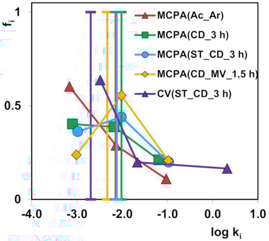 In Figure 14, the parameters of the multi-exponential equation as the spectrum fi vs. log ki are presented. Each spectrum reflects the shares of terms characterized by various rate coefficients. The vertical lines correspond to the average rate coefficients calculated based on the rate coefficients for all terms of the given system. The spectra are broad because of differentiation in the rate of particular stages of the adsorption process. The most symmetric distribution of rate parameters is observed for MCPA adsorption on the samples CD_MV_1.5 h and ST_CD_3 h which indicates a small share of rate coefficients with small values. Moreover, faster kinetics on these activated carbons corresponds to the greater contribution fi of the larger rate coefficients ki compared to the other adsorbents (greater share fi for low ki) and larger values of their rate coefficients. A visible shift of the parameter spectrum for the CV (ST_CD_3 h) system is observed in comparison to the others.