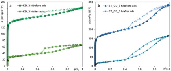 The nitrogen adsorption/desorption isotherms for the activated carbons CD_3 h (a) and ST_CD_3 h (b) before and after the herbicide adsorption.