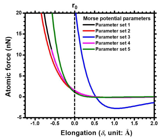 To achieve a good estimated result of the Cu’s E by using FEA-based ACM combined with the Morse potential functions, suitable and accurate Morse parameters must be determined. Consequently, five parameter sets of Morse parameters for Cu metal were obtained from different research groups to determine their similarity with the theoretical value and the measured data. Set 1 was provided by Girifalco et al. [26] and can extract the elastic constants for face-centered and body-centered metals, including Au, Ag, and Cu. The constants were calculated by using experimental values, such as the vaporization energy, lattice constant, and compression. Set 2 was obtained from Cotterill et al. [27]. The atom arrangement at the dislocated edge was depicted by central-force approximation with a reflected truncation. Various energy functions, including the Morse potential, were used to calculate the stacking-fault energy, which was highly dependent on the potential form and truncated dimension. In set 3, the relevant constants were based on the second-order and third-order elastic constants of cubic metals such as Cu, Ag, and Al [28]. The interaction of atoms was described based on the Morse parameters, which were determined based on the physical characteristics of the bulk modulus and cohesive energy. Another set of potential constants was obtained from a nanoscale machining study of tool wear and fraction [29]. In set 4, MD combined with the Morse potential was used to calculate the friction of dissimilar materials at the tool–work interface. Similarly, the Morse parameters of set 5 were subjected to an MD simulation to explore the phonon dispersion curves and the dependence of the Debye temperature for Cu lattices [30]. The calculated results agreed well with the experimental data. Table 1 lists the Morse parameter sets from these five resources. Moreover, the relations between the applied force and elongation (δ, with respect to r0) of a pair of Cu atoms on the basis of the corresponding Morse parameters are shown in Figure 1.