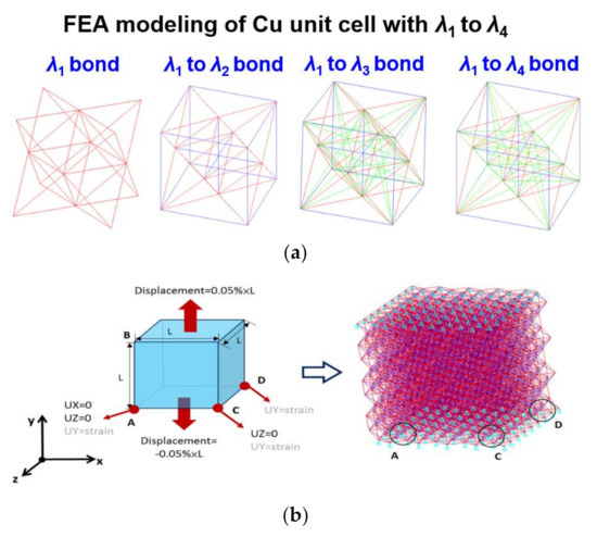 The atomic-level FEA modeling of single crystal Cu: (a) Modeled node (atom) and interactive bonding between atoms, considering first to fourth nearest neighbor atoms’ bonding; (b) Boundary conditions of single crystal Cu with a cube having a length of 30 Cu lattice constants (3.61 Å) when a 0.1% tensile uniaxial strain is loaded.