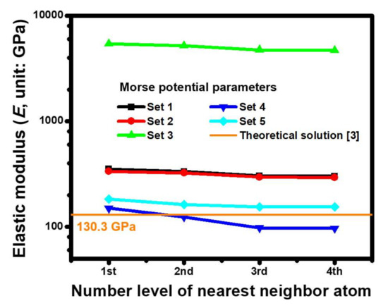 To determine the Morse parameters that can be combined with the present ACM simulation and acquire good estimated results as compared with the theoretical solutions, the estimated results obtained using the parameters provided from the five sets were compared with each other. Given the selected example of the predicted results for the orientation of Cu(110) (Figure 4), the range impacts of the force field truncated among the Cu atoms are included by increasing the cut-off levels of the nearest neighboring atom under a fixed cubic volume with an edge length of 30 a (a = 3.61 Å). In other words, considering the different spring constants in the ACM model, the interactive forces among the atoms of a Cu lattice would further approach the bonding conditions of the actual Cu crystal structures. The analytic results revealed that the estimated result of 154.1 GPa, obtained by introducing the Morse parameter of set 5 into the ACM-based FEA, agreed well with the E of 130.3 GPa. The E was reduced from 182.7 GPa to 154.1 GPa when the effective spring constants within the ACM model were accumulatively considered from the first to fourth nearest neighboring atom. In addition, the ACM results of the third and fourth nearest neighboring atoms were nearly identical, implying that the cut-off was sufficiently large to calculate the effect of the atomistic force field at that moment. Consequently, the parameters of set 5 were the best among all the sets because the predicted deviations in other sets were quite evident. Based on the analytical results and discussed consequences, the subsequent results of the ACM analysis were obtained by utilizing the Morse parameters of set 5.