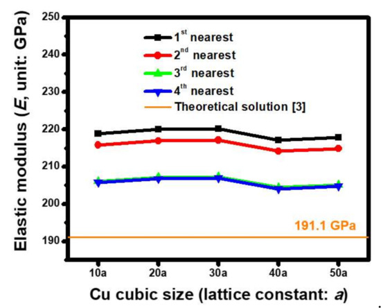 Three lattice orientations in a single-crystal Cu cube, including Cu(100), Cu(110), and Cu(111), were separately built, based on the ACM analysis, in order to extract the corresponding E. As shown by the estimated results of Cu(100) in Figure 5, the size dependence of the Cu crystal, under various interactive extents between atoms, on the E was analyzed. The Cu dimensions changed from 10 a to 50 a (a = 3.61 Å), which did not significantly influence the mechanical characteristics because the estimated E was only reduced by 3.38% from 89.71 GPa to 86.77 GPa. This phenomenon was attributed to the examined size range from 3.61 nm to 18.05 nm, which was regarded as being small at the nanoscale level. Consequently, a micro- to macrolevel size effect was excluded in this analysis. Compared to this, the force field effect was significant. When taking the example of a Cu cube with a 50 a (a = 3.61 Å) edge, the effect of the E was only equal to 121.81 GPa if the first nearest bonding force of a pair of atoms was considered. A magnitude of 92.37 GPa was predicted when the second nearest bonding force was included. This behavior was attributed to a fresh force equilibrium within the ACM model of the generated Cu lattice. When the balanced conditions were further enhanced by considering the other two high-order bonding forces, i.e., the third and fourth nearest interactions of atoms, the foregoing effective E finally converged to 86.8 GPa. Similar simulated procedures were adopted, and the estimated ACM results at the orientations of Cu(110) and Cu(111) are shown in Figure 6 and Figure 7, respectively. As shown by the converged extent of the calculated modulus in these figures, at least the first three nearest bonding forces should be considered in order to meet the requirements of the range for the interactive force field within a Cu lattice. Table 3 summarizes the estimated results obtained by ACM analysis proposed in this study and the data collected from previous work. The oriented dependence of the nanoscale effective elastic moduli extracted by ACM simulation was slightly greater than the theoretical values. The reason for such a difference was the size effect. Moreover, the measured data of the Cu crystals demonstrated that the estimated results were reasonably acceptable because the predicted magnitude was located within the distributed scope of the experimental data.