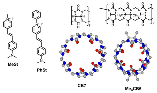 Structures of the indicator dyes MeSt and PhSt and cucurbiturils CB7 and Me4CB6.