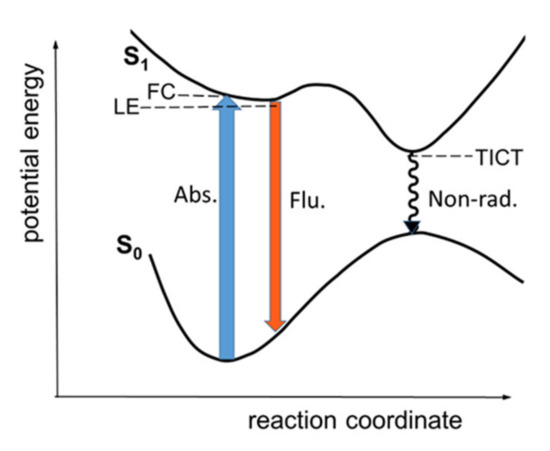 The photophysical properties of PhSt were interpreted in terms of the scheme of photoinduced processes in Figure 2, which is similar to the scheme proposed for the photocycle of MeSt on the basis of detailed experimental and theoretical studies [31,32,33]. The model considers two routes for the deexcitation. Following the photoexcitation into the Franck-Condon (FC) state, the dye returns to the S0 surface either from a partially relaxed ‘locally excited’ (LE) state, which a radiative process, or the relaxation goes through a TICT state which is dark. The latter is considered the dominant non-radiative process. In MeSt, the rotation around the aniline-vinylene bond is the likely TICT process [32,34,35,36].