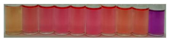 Photograph of 2 × 10−5 M solutions of PhSt in (from left to right) water, methanol, ethanol, n-propanol, i-propanol, n-butanol, t-butanol, acetonitrile, acetone, and dichloromethane.