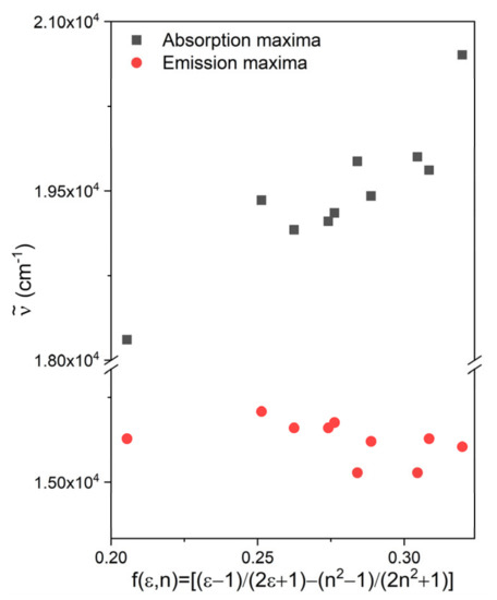 The wave numbers of the absorption and fluorescence bands of PhSt are plotted as functions of the solvent polarity function (orientation polarizability), f(ε,n) in Figure 4. As these diagrams show, the absorption maximum shifts to the blue with increasing solvent polarity, i.e., PhSt is a negatively solvatochromic dye. The position of the fluorescence band is less sensitive to the solvent. Overall, the dye shows a weak positive fluorosolvatochromism. The spectral data measured in CH2Cl2 deviate from the above trends, which may suggest that PhSt forms loose ion pairs in solvents of low polarity [38].