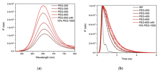 (a) Fluorescence spectra and (b) decay curves measured in polyethylene glycol (PEG) solutions. The spectra were measured at λex = 512 nm; the decay curves were recorded using a 450 nm pulsed diode laser.