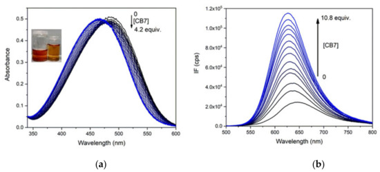 (a) Absorption spectra of 1.5 × 10−5 M solution of PhSt in pH 8.0 buffers in the presence of 0–4.2 equiv. CB7, (b) fluorescence spectra of 1.0 × 10−6 M solution of PhSt in the presence of 0–10.8 equiv. CB7, λex = 468 nm, the isobestic point of the absorption spectra.