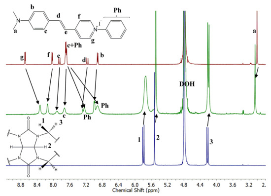 The spectrum of the 1:1 mixture shows a full complexation. In the spectrum of the complex, the signals of Ph protons shift strongly upfield, proving the encapsulation of the phenyl ring in the cucurbituril cavity. The g protons shift upfield, the f protons downfield, indicating the interaction between the positively charged pyridinium N-atom of the guest and the electron-rich carbonyl rim of the host. A similar opposite shift of the α- and β-protons of the pyridinium unit was observed in the spectrum of the CB7 complex of dibenzyl-viologen and was attributed to a similar structure with only one of the benzyl groups encapsulated [45]. The signals of the ethylene and aniline units of PhSt are shifted downfield which may derive from the reduced effective charge, i.e., the reduced electron withdrawing ability of the pyridinium group bound to the carbonyl rim of CB7.