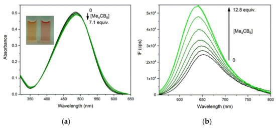 On the addition of Me4CB6, the absorption band of PhSt shifted to the red, in contrast to the blue shift induced by CB7, while the fluorescence band of the dye showed a blue shift (see Figure 9). A fitting to the fluorescence spectra yielded Ka = 1.1 × 106 M−1 in neat water and 2.5 × 104 M−1 in the pH 8.0 buffer. The spectral shifts seem to indicate a reduced polarity of the environment for the complex dye.