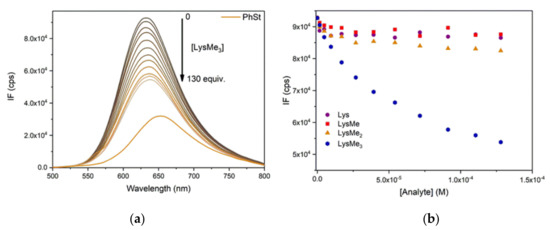 (a) Fluorescence spectra of PhSt-CB7 assay ([PhSt]0 = [CB7]0 = 1.0 × 10−6 M) in pH 8.0 buffers in the presence of 0–130 equiv. LysMe3; (b) Fluorescence intensities of the assay at 632 nm in the presence of 0–130 equivs. Lys, LysMe, LysMe2 and LysMe3. λex = 475 nm. The spectra of PhSt-LysMen-CB7 ternary systems can be seen in the Supplementary Material (Figure S9).