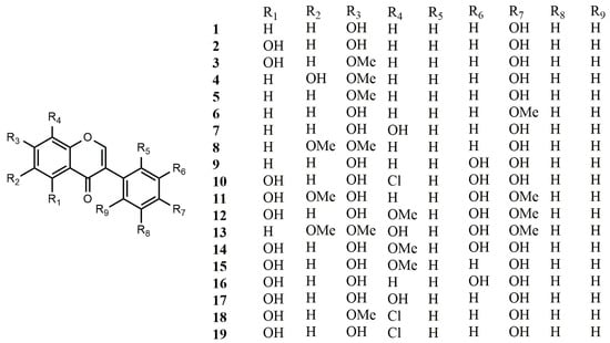 Reported structures of simple isoflavones 1–19 from fungi and actinomycetes.