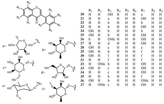 Reported structures of isoflavonoid glycosides 20–37 from fungi and actinomycetes.