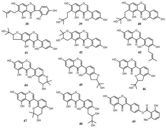 An antifungal luteone, 5,7,2′,4′-tetrahydroxy-6-(3,3-dimethylallyl) isoflavone (38), was obtained from the cultures of Aspergillus flavus and Botrytis cinerea. At the level of 7–14 μg/cm2, the growth of Chlamydia herbarum was completely inhibited by compound 38 []. Four compounds, luteone hydrate (39), luteone metabolite AF-2 (40), BC-1 (41), and BC-2 (42), were obtained from the co-cultures of A. flavus and B. cinerea. Five isoflavonoids, M-1-1 (44), M-1-2 (45), M-2 (46), M-3-1 (47), and M-3-2 (48) were isolated from the fungus A. flavus or B. cinereal by converting licoisoflavone A (43). When their inhibitory ability to grow Cladosporium herbarum was tested, compounds 38 and 43 were found to completely inhibit growth at the level of 25–100 μg/cm2, while compound 44 had only a small inhibition zone at the level of 100 μg/cm2 []. A new isoflavone, genistein-4′-(6″-methyl)-salicylate (49) was obtained from Streptomyces sp. GW27/2506 [].