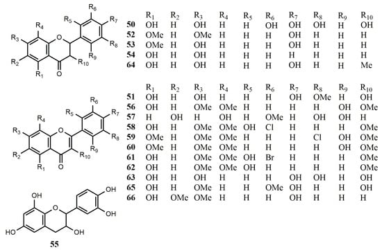 Reported structures of simple flavonoids 50–66 from fungi and actinomycetes.