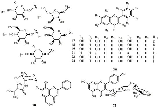 Flavonoid glycosides derived from endophytic fungi were reported for the first time in 2016. Three quercetin-3-O-glycosides, named guaijaverin (67), isoquercitrin (68), and hyperin (69), were isolated from the endophytic fungus Nigrospora oryzae. The fungus was isolated from the leaves of the Nigerian mistletoe Loranthus micranthus, which was widely used in African traditional medicine []. Actinoflavoside (70), possessing a rare 2,3,6-trideoxy-3-amino-ribopyranoside aminosugar skeleton, was obtained from the fermentation broth of a marine Streptomyces sp. []. A flavonoid glycoside, daidzein-4′,7-di-(2-deoxy-α-L-fucopyranoside) (71), was obtained from actinomycetes, which showed moderate activity against tumor cells of A549, HepG2, and HCT116 [].