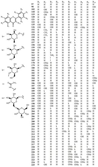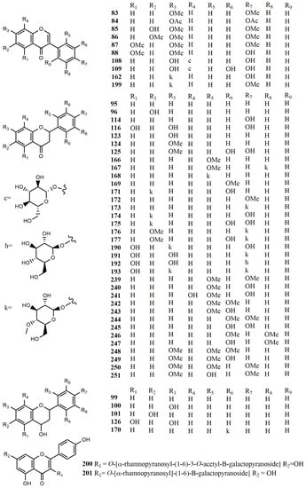 Glycosylation is an effective means to regulate the solubility, stability, bioavailability, and bioactivity of natural product drugs. Several important flavonoid aglycones were studied for their glycosylated transformation by microorganisms. Naringenin (116) was glycosylated to form 4′,5-dihydroxyflavanone 7-O-β-D-(4-O-methyl) glucopyranoside (190), 5,7-dihydroxyflavanone 4′-O-β-D-(4-O-methyl) glucopyranoside (191), 5,7-dihydroxyflavanone 4′-O-β-D-glucopyranoside (192) and 5-hydroxyflavanone 4′,7-di-O-β-D-(4-O-methyl) glucopyranoside (193) by I. fumosorosea ACCC 37814. Luteolin (194) was transformed to 4′,5,7-trihydroxyflavone 3′-O-β-D-(4-O-methyl) glucopyranoside (195) and 3′,5,7- trihydroxyflavone 4′-O-β-D-(4-O-methyl) glucopyranoside (196) by the strain ACCC 37814 via (4-O-methyl)-glucosyl substituted. Diosmetin (197) was transformed to 5,7-dihydroxy-4′-methoxyflavone 3′-O-β-D-(4-O-methyl) glucopyranoside (198) by the strain ACCC 37814 via 4-O-methyl-glucosyl substituted. Formononetin (6) was glycosylated to generate 4′-methoxyisoflavone 7-O-β-D-(4-O-methyl) glucopyranoside (199) by the strain ACCC 37814 [].