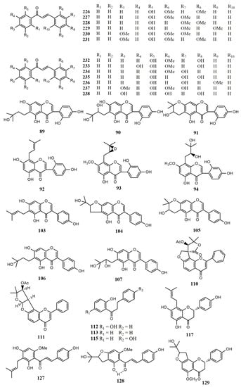 The study on the biotransformation of filamentous fungi found that Trichoderma harzianum NJ01 could convert puerarin (108) to 3′-hydroxypuerarin (109) with a conversion rate of up to 41% under the optimal conditions. In the DPPH free radical scavenging system, compound 109 was 20 times more active than 108. The solubility of 109 is 1.3 times higher than 108 []. Glabratephrin (110) was obtained from Tephrosia purpurea and transformed into pseudosemiglabrin (111) by the culture of A. niger. The transformation process is realized by using the open loop and the closed loop of the five-member ring [].