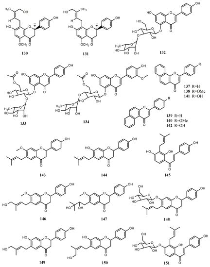 Xanthohumol (127) was converted as a substrate to obtain (2S)-8-[4″-hydroxy-3″-methyl- (2″-Z)-butenyl]-4′,7-dihydroxy-5-methoxy-flavanone (130) and (2S)-8-[5″-hydroxy-3″-methyl-(2″-E)- butenyl]-4′,7-dihydroxy-5-methoxyflavanone (131) by Cunninghamella echinulata NRRL 3655. Compounds 127, 130, (E)-2″-(2″′-hydroxyisopropyl)-dihydrofurano[2″,3″:4′,3′]-2′,4-hydroxy-6′- methoxychalcone (128) and (2S)-2″-(2‴-hydroxyisopropyl)-dihydrofurano[2″,3″:7,8]-4′-hydroxy- 5-methoxyflavanone (129) were obtained from Pichia membranifaciens which showed antimalarial activity against Plasmodium falciparum [].