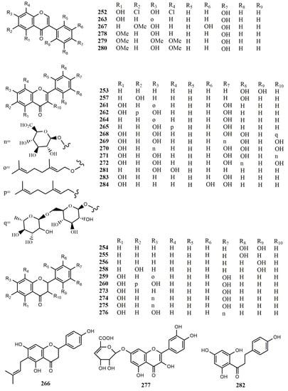 Flavonoid derivatives are natural products commonly found in medicinal plants and are synthesised from phenylpropanoid and acetate-derived precursors []. Some flavonoids have also been discovered from fungi and actinomycetes. We also classified these flavonoids into three groups: simple flavonoids, flavonoid glycosides, and complex flavonoids, and the structures of the compounds are shown in Figure 4, Figure 5 and Figure 6, respectively. Most of these compounds mainly exhibit antioxidant, antimicrobial, anti-inflammatory, antitumour, antifouling, and α-glucosidase inhibitory activity.