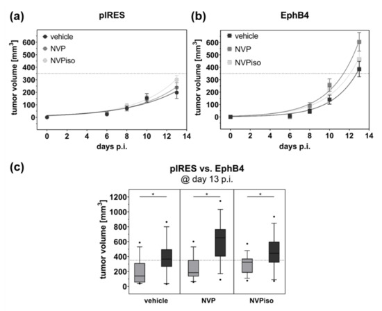 Tumor growth of A375-pIRES and A375-EphB4 tumors after treatment with vehicle, NVP, or NVPiso. Tumor volume was calculated from caliper measurement until 13 days after s.c. injection of 5 × 106 A375-pIRES (a) and A375-EphB4 (b) cells. Values represent mean ± SEM (n = 14–15). (c) Comparison of calculated tumor volumes for A375-pIRES (light grey) versus A375-EphB4 (dark grey) tumors at day 13 p.i. in the three treatment groups (vehicle, NVP, NVPiso). Data within the boxes represent 10th–90th percentile (* p < 0.05) of ratios between A375-pIRES (light grey) and A375-EphB4 tumors (dark grey).