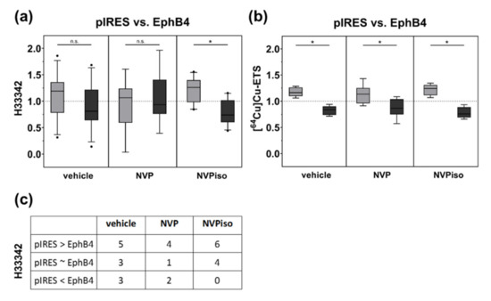 With regard to tumor perfusion, measured by i.v. injection of the radiotracer [64Cu]Cu-ETS and subsequent radioluminography of tumor sections, we observed a decrease in tumor perfusion by overexpression of EphB4 in the vehicle group (Figure 3b). This is in accordance with our previous study [29]. Moreover, we observed the same effect for the mice treated with either NVP or NVPiso. By trend, the perfusion difference between A375-pIRES and A375-EphB4 tumors was less pronounced in the NVP group, however, this could probably be caused by a higher heterogeneity of the measured tumor volumes.