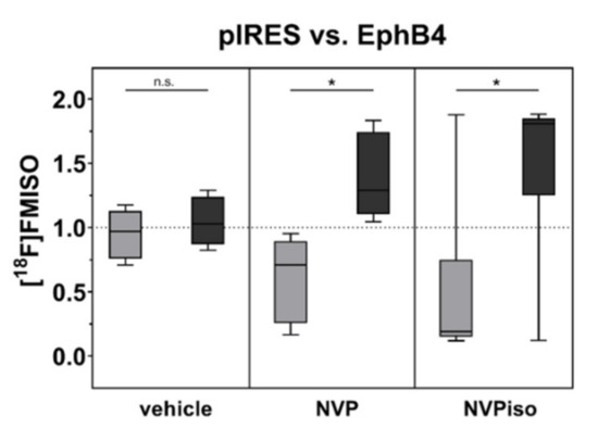 Tumor hypoxia was analyzed by i.v. injection of the radiotracer [18F]FMISO (n = 5–6) and subsequent radioluminography of 27 representative tumor sections for each tumor. Data within the boxes represent the 10th–90th percentile (* p < 0.05) of ratios between A375-pIRES (light grey) and A375-EphB4 tumors (dark grey).
