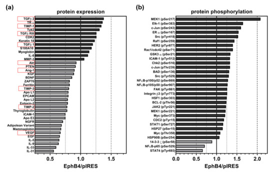 Relative change of (a) expression of cancer-related proteins (including angiogenesis-related proteins, highlighted in red) and (b) phosphorylation of signaling proteins in A375-EphB4 cells in comparison to A375-pIRES cells. Bars represent ratio of A375-EphB4/A375-pIRES cells calculated from means of average array signals from 6 independent spots for proteins with increased expression/phosphorylation (dark grey) and decreased expression/phosphorylation (light grey) in A375-EphB4 cells.